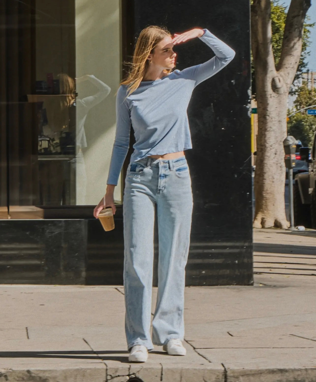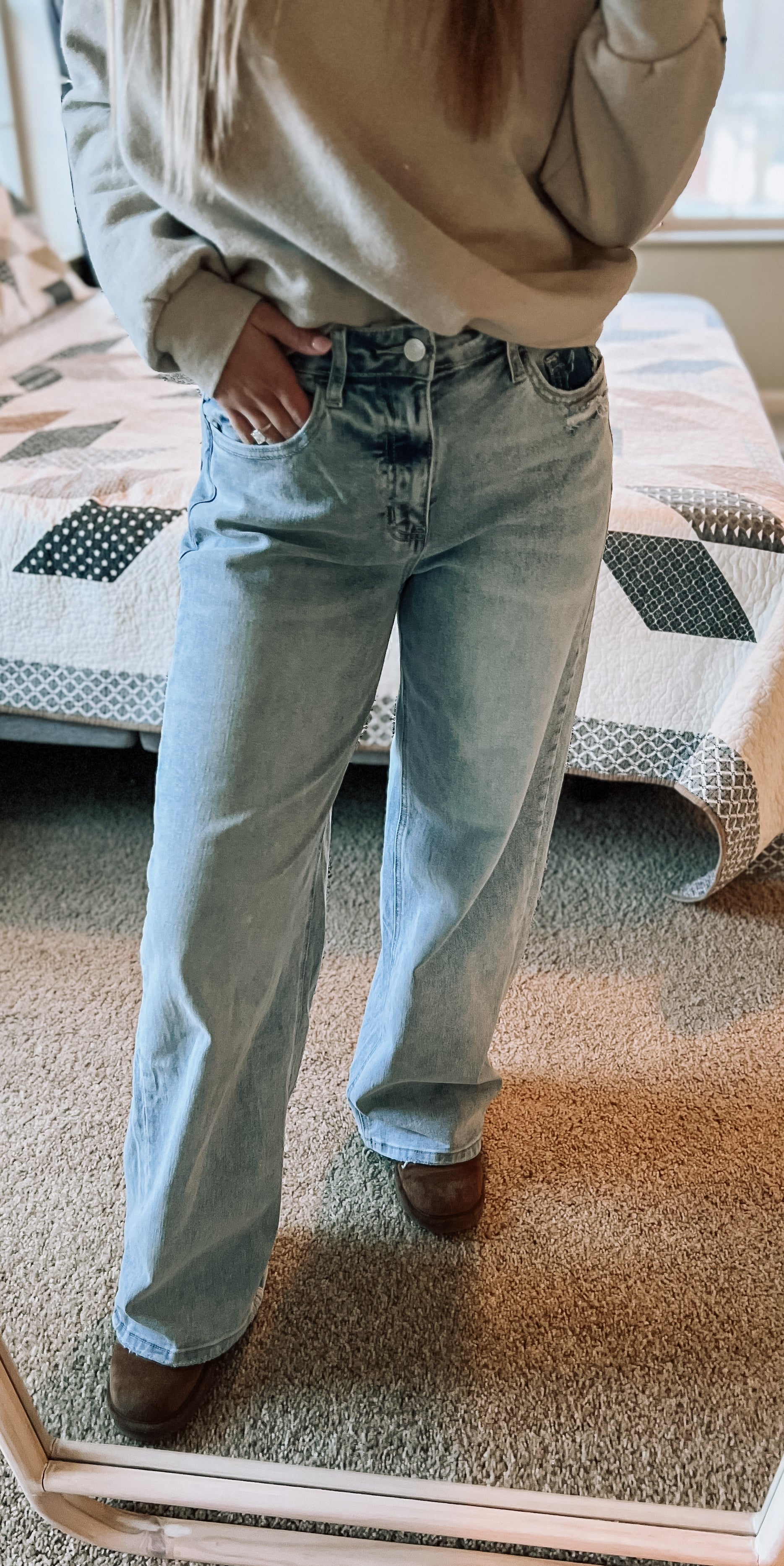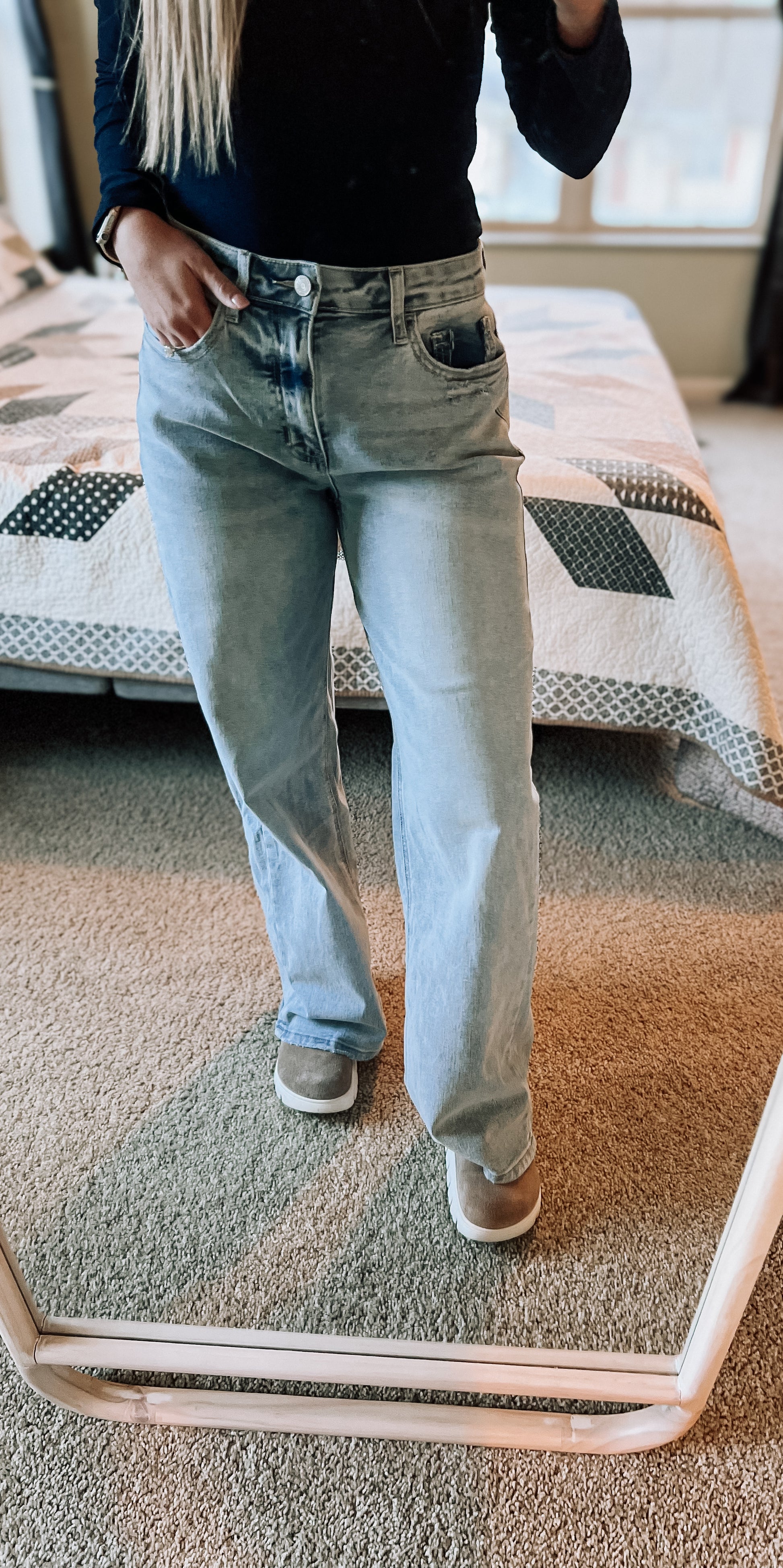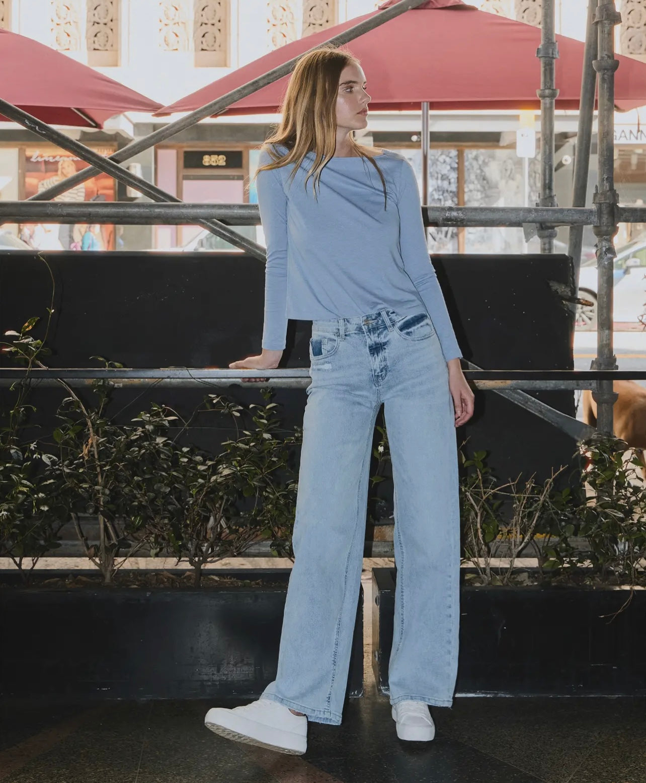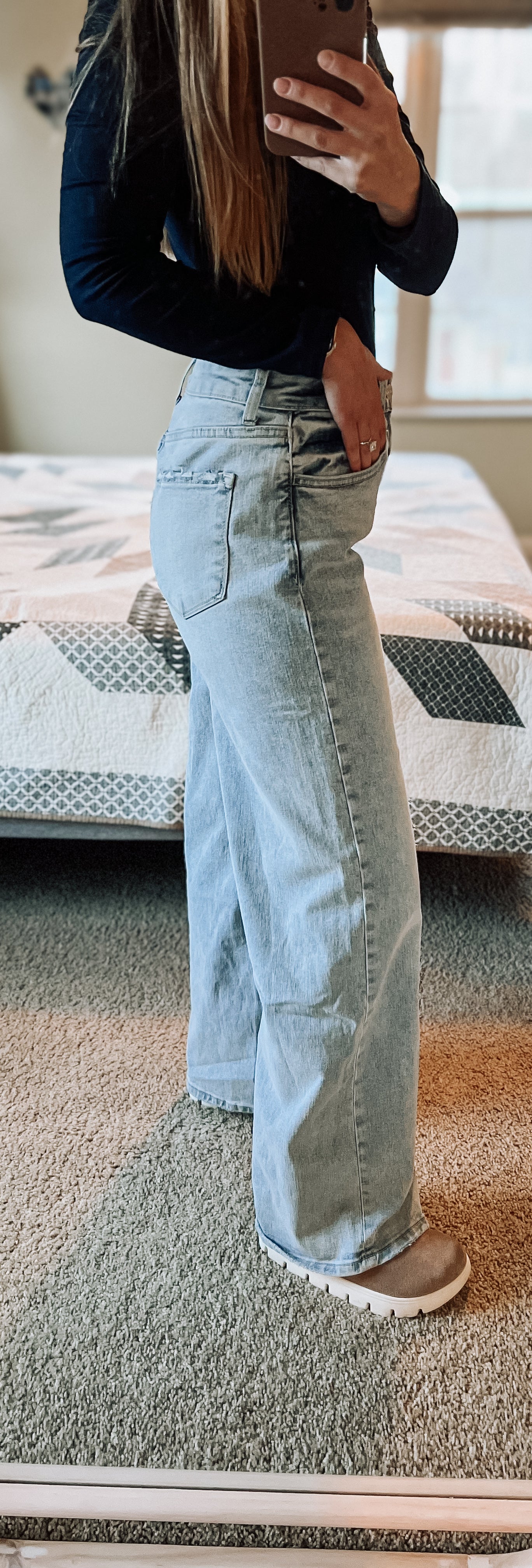 Comfort stretch denim, high rise waist, finished hem, full length, super wide leg jeans