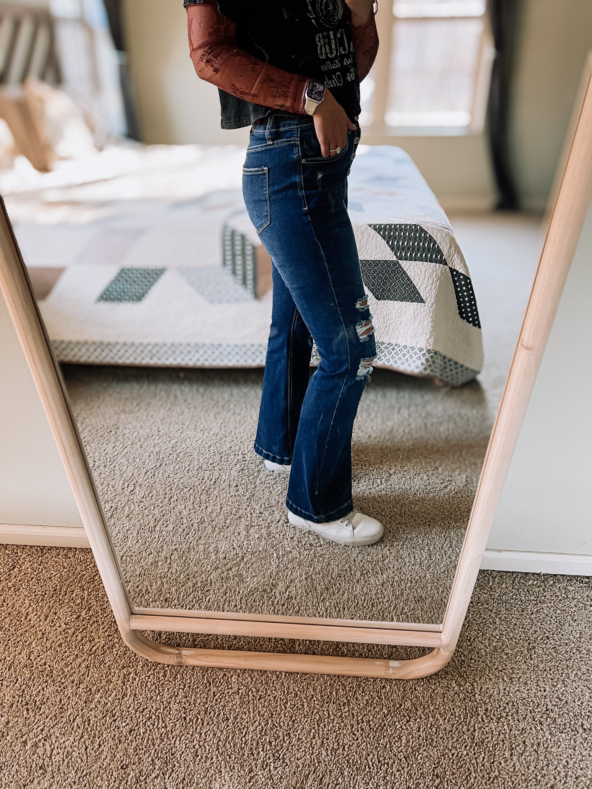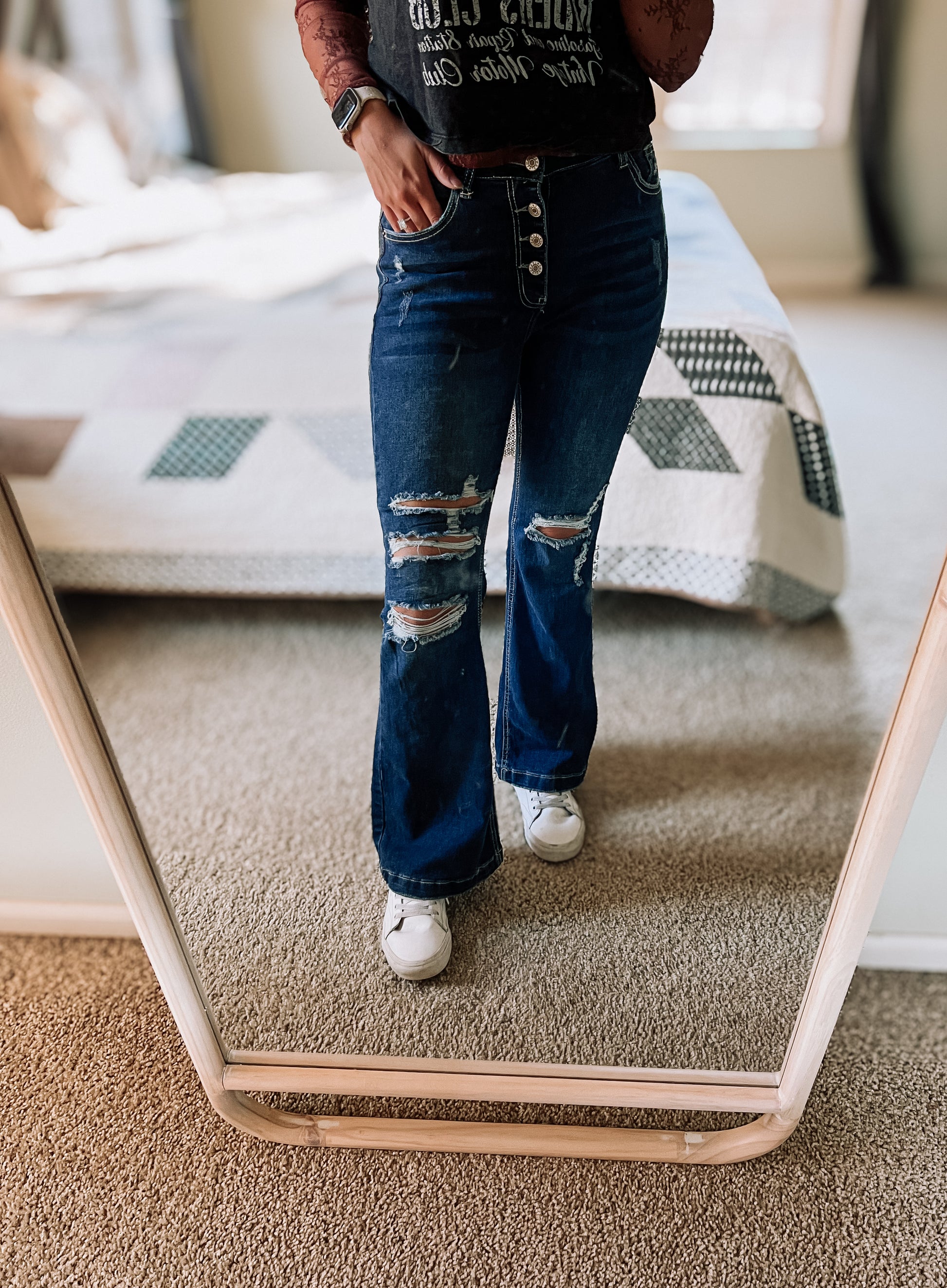Rock these rad flared jeans in a fab medium and dark wash! Sporting a 4 button closure, grungy distressing, frayed hem, and classic 5 pocket design, these jeans are perfect for pairing with a blouse, tee, sweater, or sweatshirt!
