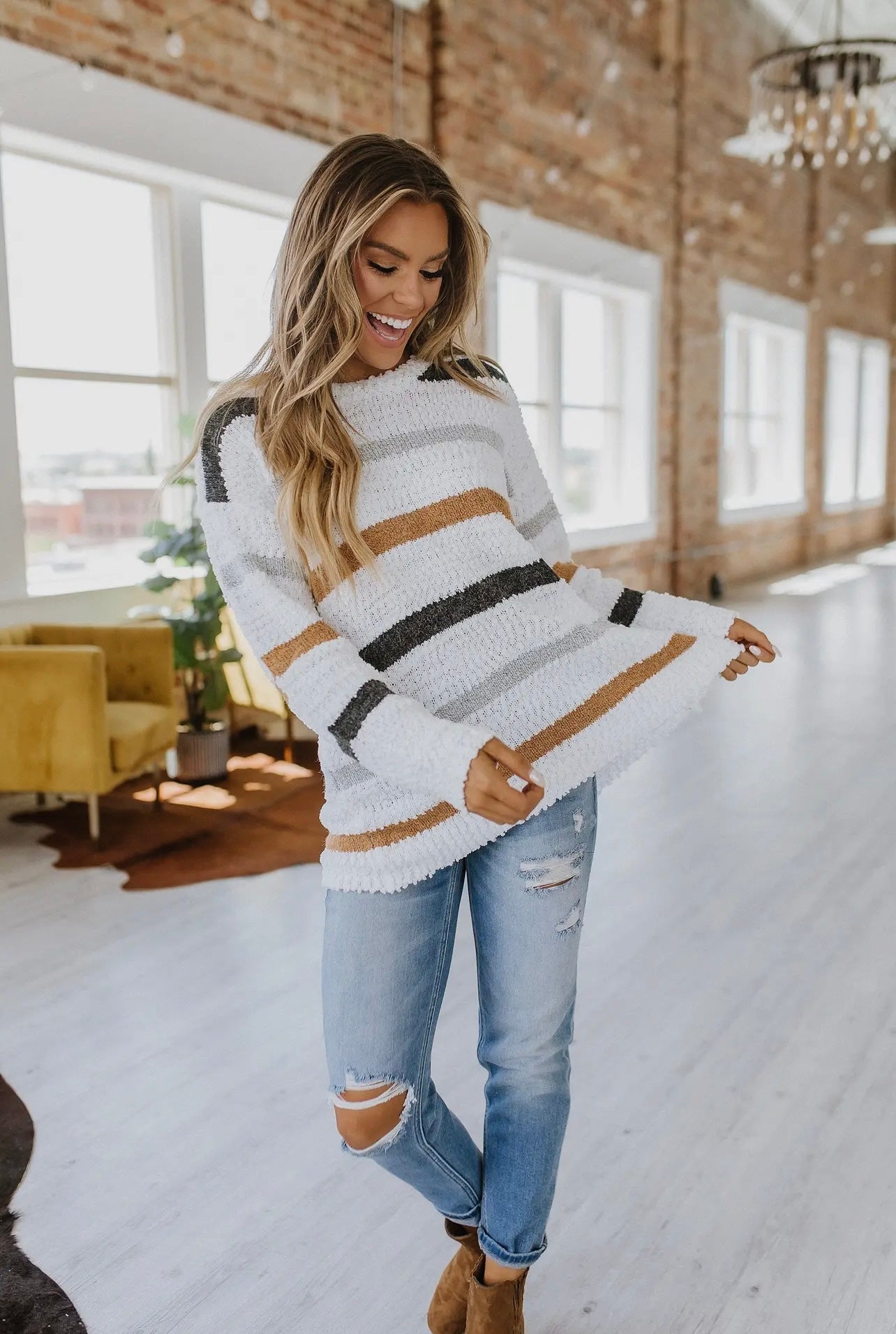 Look cozy and stylish with the Mckinley Striped Popcorn Sweater! Crafted with popcorn yarn, this warm sweater is designed with bold vertical stripes to bring out your fashion-forward style. Enjoy your cool-weather wardrobe in style.