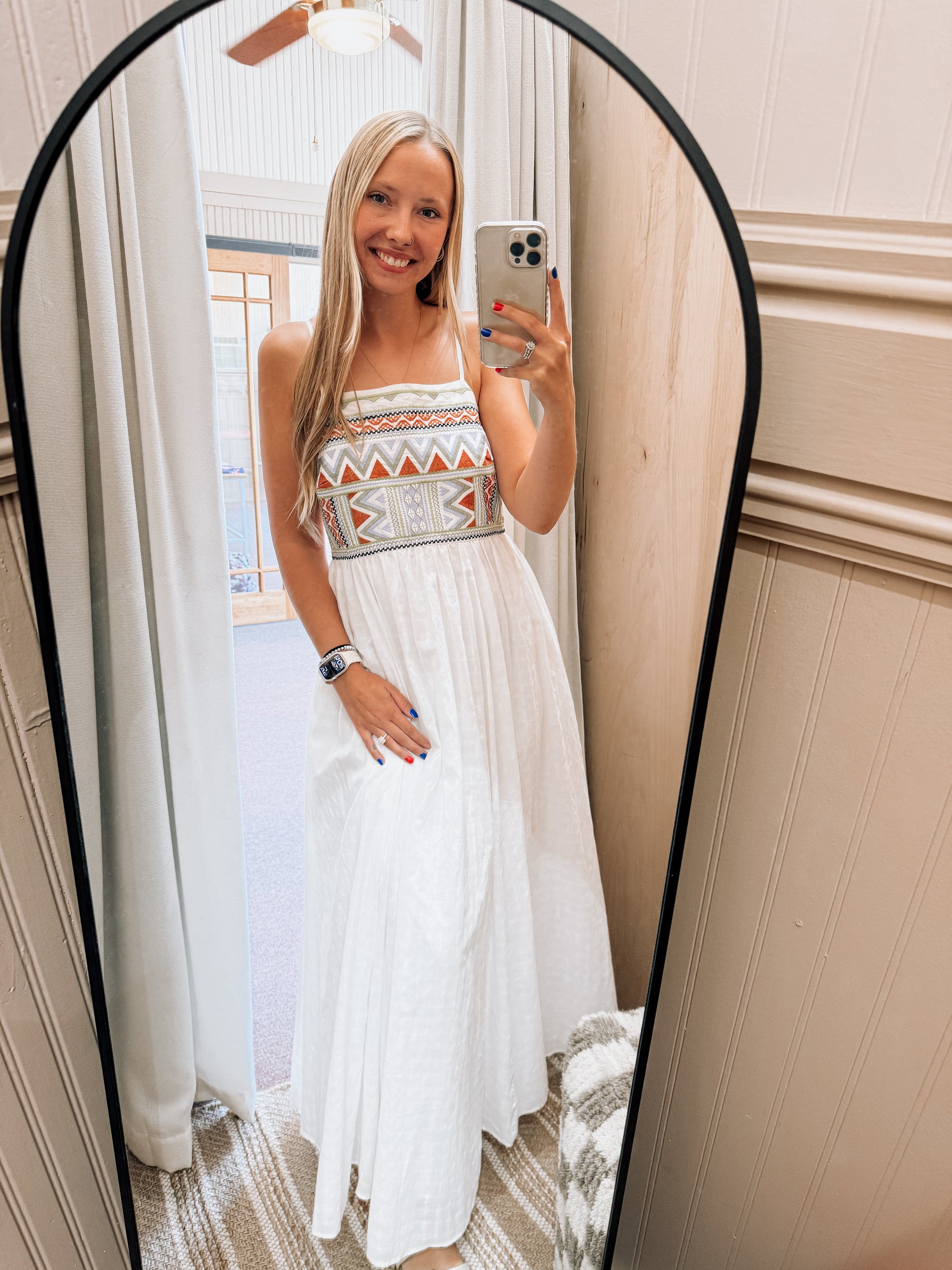 A white-hot statement piece with a pop of desert-inspired embroidery. A breezy, textured fabric that flows with every step and a detailed smocked back for an easy, flattering fit. Perfect for sunny days, market strolls, or that casual bride moment.