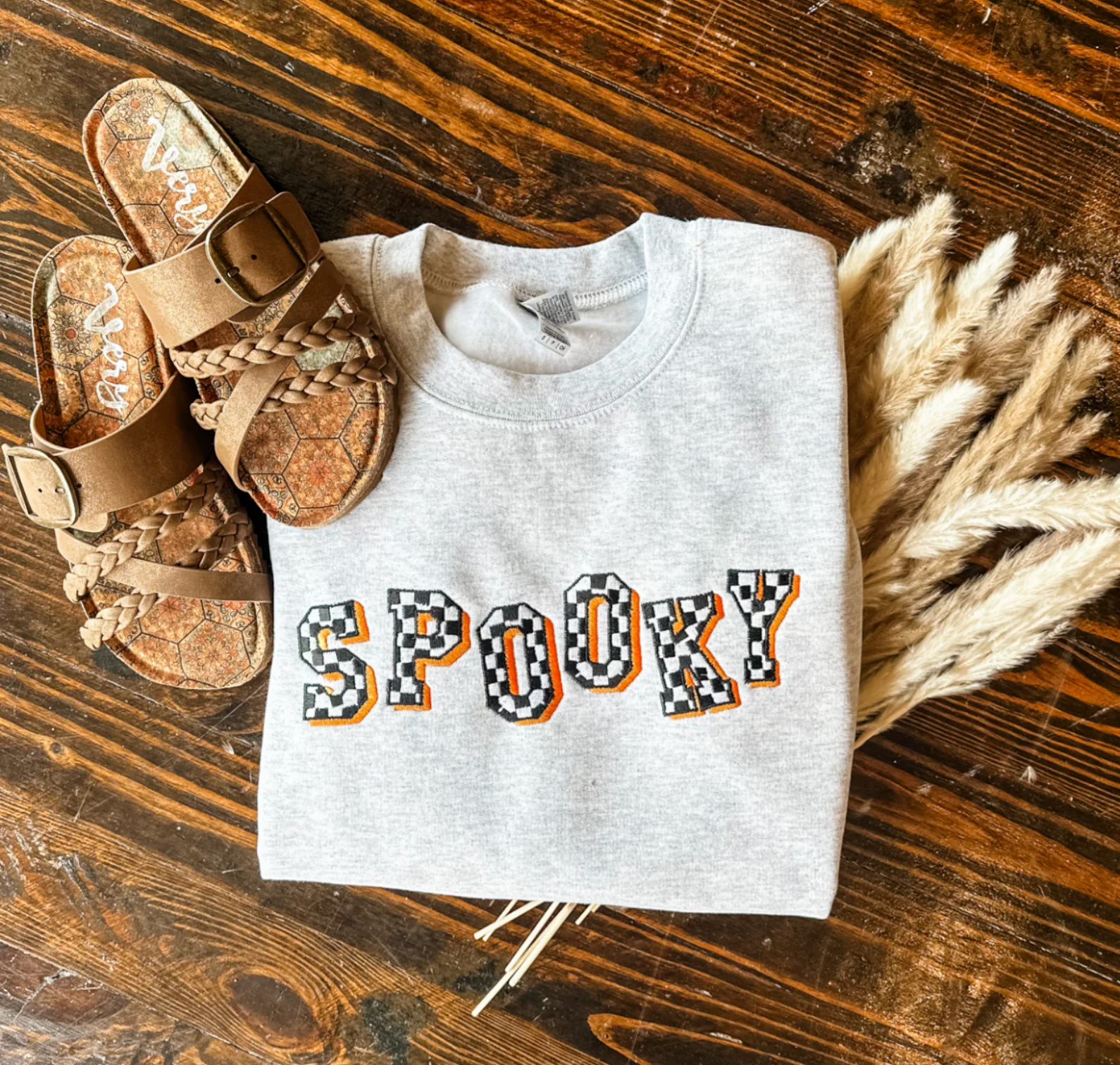 fall chills, meet your new favorite layer. This neutral crew brings the perfect pop of playful with bold checkered "spooky" lettering across the front. It's cozy, casual, and just the right amount of festive for your haunted hayrides, movie nights, and everything in between.
