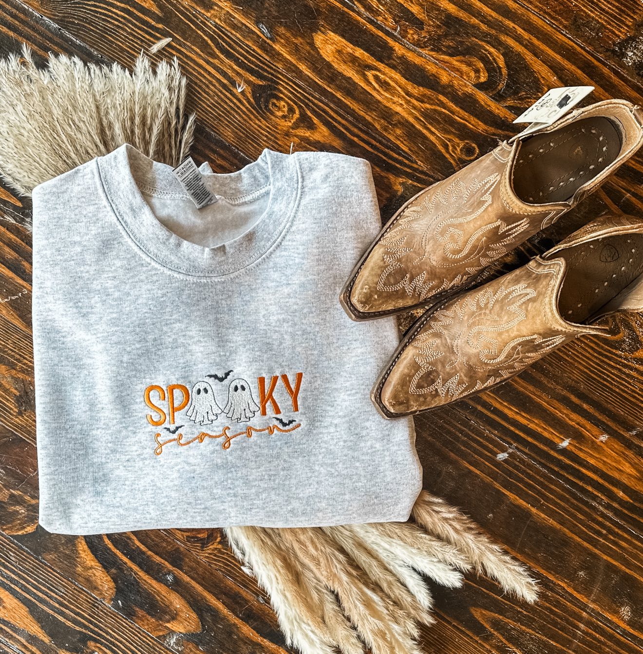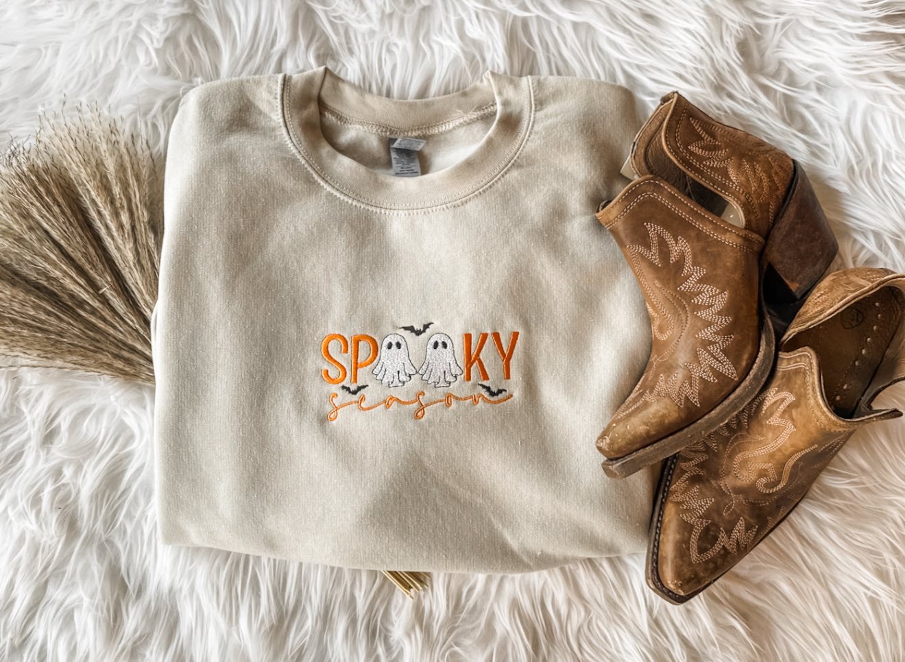 spooky season but make it sweet. This soft crewneck features the cutest little ghosts tucked into bold "spooky" lettering, with a playful script underneath. It's subtle, festive, and perfect for everything from pumpkin picking to couch lounging.